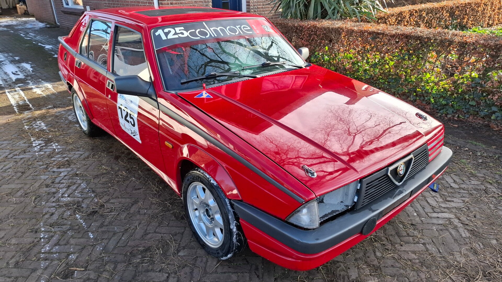 De auto heeft de nodige battlescars en ouderdomssporen, wat normaal is voor een auto van deze leeftijd en die actief geweest is in de motorsport. Verwacht geen nieuwe auto, maar de rode lak ziet er nog steeds goed uit en straalt.